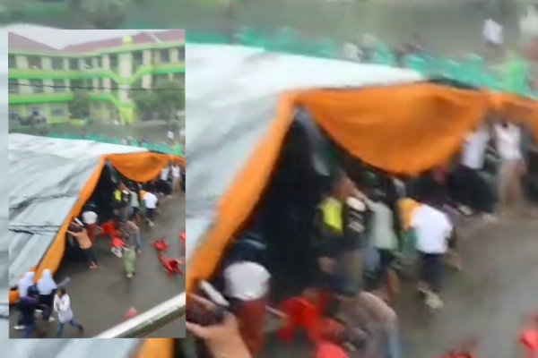 Disisi lain, sebuah tenda dan panggung yang di gunakan untuk mencoblos dan tempat duduk bagi calon Kades di Desa Larangan, Kecamatan Larangan, ambruk di sapu angin kencang.