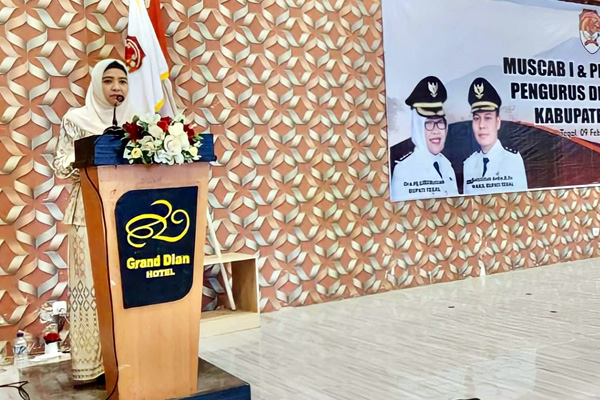 Anggota Komisi IX DPR RI, Dr. Hj. Dewi Aryani memberi pesan kepada para kades pada Muscab ke-1 Papdesi Kabupaten Tegal di Grand Dian Hotel Slawi. (Foto: Dok/Tim DeAr)