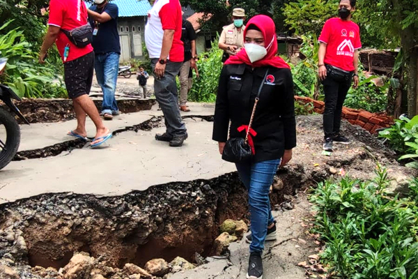 "Medannya luar biasa, kita lihat tadi, ruas-ruas jalan mulai mengalami keretakan dan kemiringan yang cukup parah. Ini sangat-sangat membahayakan warga," ungkap Dewi Aryani saat tiba di lokasi terparah.
