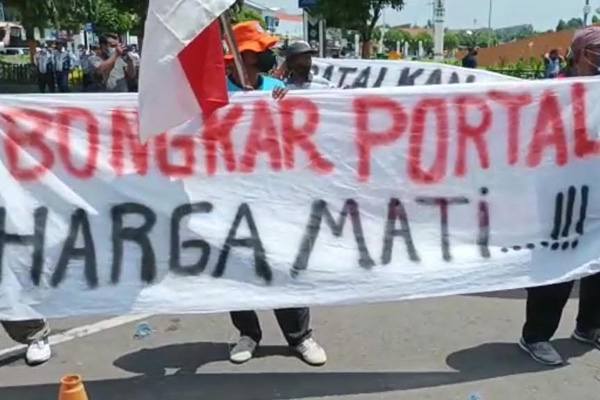 Pamlet dan spanduk yang dibentangkan pendemo diantaranya bertuliskan “Gara-gara Portal digembok, Kami Berduka”, “Bongkar Portal, Harga Mati”, dan “Turunkan Walikota”.