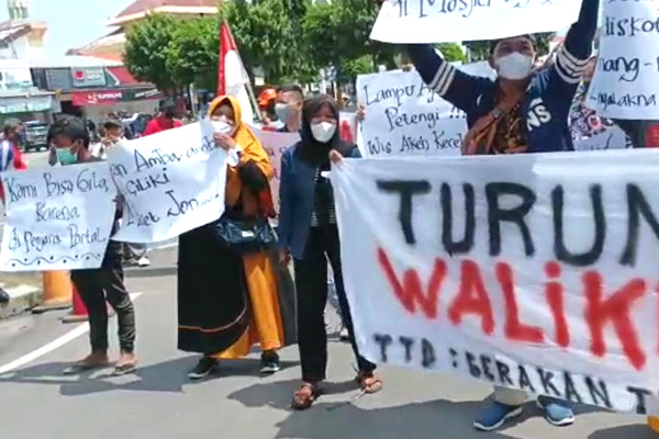 “Alesané menghindari kerumunan, tapi déwék ngadakena motor-motoran. Menghindari kerumunan, dia sendiri berkumpul dengan anak-anak SD. Dangdutan. Kuduné demo kiyé ngawa dangdut, bén walikotané gelem metu,” teriaknya lagi.