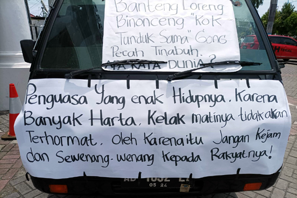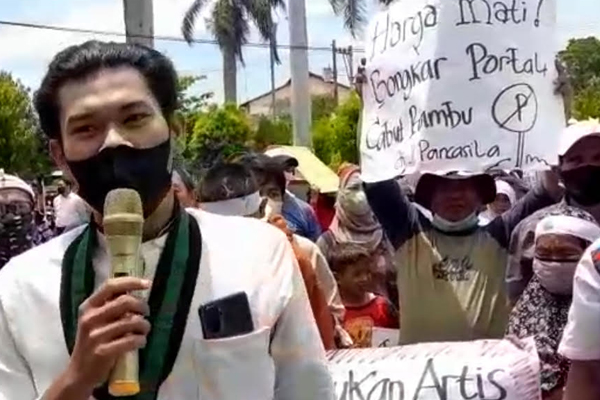 “Portal di sekitar kawasan alun-alun dan Jalan Pancasila harus dibongkar,” teriak Edi Bongkar saat orasi.