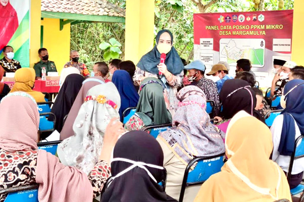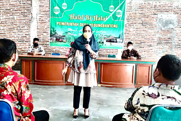 Anggota Komisi IX DPR RI, Dr. Hj. Dewi Aryani memberi sambutan dan pengarahan pada Halal Bihalal di Desa Kedungbanteng, Kabupaten Tegal. (Foto: Dok/Tim DeAr)