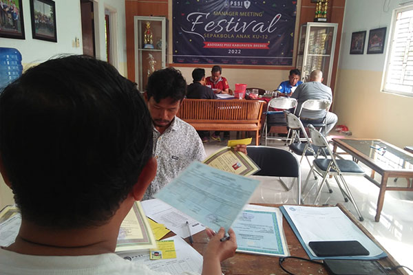 Panitia Festival Sepakbola U-12 tengah menyeleksi berkas persyaratan peserta di Kantor Askab PSSI Brebes. (Foto : Takwo Heriyanto)
