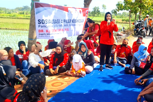 Anggota MPR-DPR RI, DR. Hj. Dewi Aryani menggelar sosialisasi 4 Pilar Kebangsaan di jalan persawahan Desa Plumbungan dan Maribaya, Kecamatan Kramat, Kabupaten Tegal. (Foto: Dok/Tim DeAr)