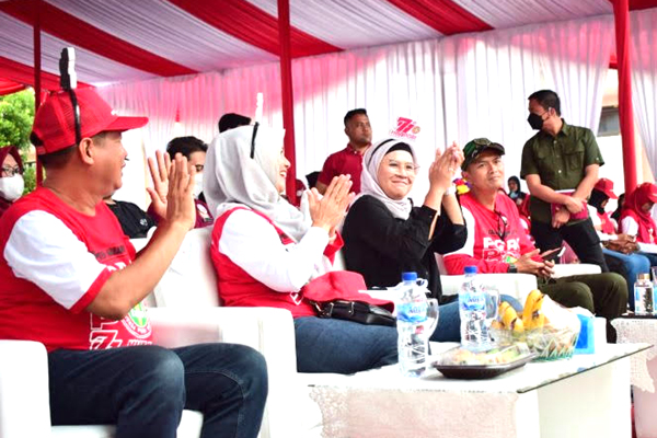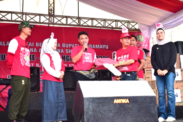Bupati Indramayu, Nina Agustina mengundi dan secara simbolis memberikan hadiah gerak jalan santai HUT ke-77 PGRI. (Foto: Dok)