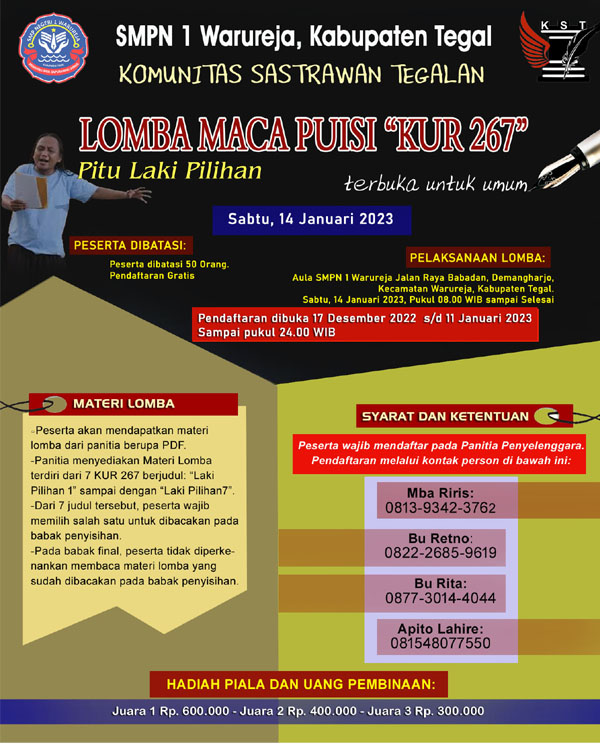PanturaNews (Tegal) - Bekerjasama dengan Komunitas Sastrawan Tegalan, SMP Negeri 1 Warureja Jalan Raya Babadan, Demangharjo, Kecamatan Warureja, Kabupaten Tegal, membuka pendaftaran Lomba Baca Puisi "KUR 267" untuk umum.