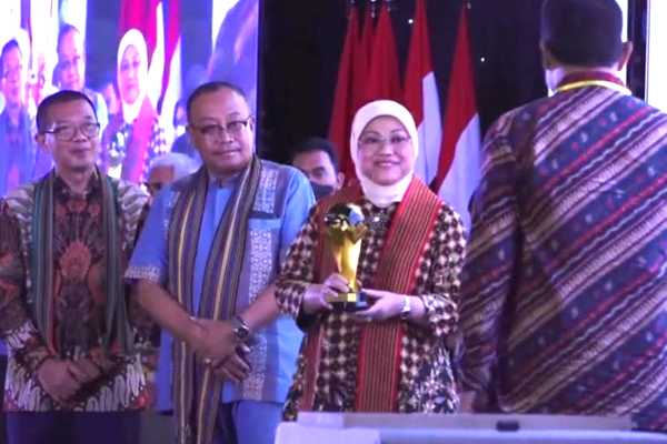Kepala Disnaker Indramayu, Erpin Marpinda menerima penghargaan IMWA Tahun 2022 di Balai Pelatihan Vokasi dan Produktivitas Lombok Timur. (Foto: Dok/ Diskominfo)