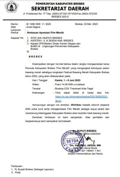 Sehubungan dengan hal tersebut, dihimbau kepada seluruh pegawai ASN untuk turut serta mengapresiasi Film Mbutik sebagai wujud peduli dan mendukung kebanggaan Kabupaten Brebes akan kearifan lokal bawang merah. Demikian bunyi isi surat tersebut.