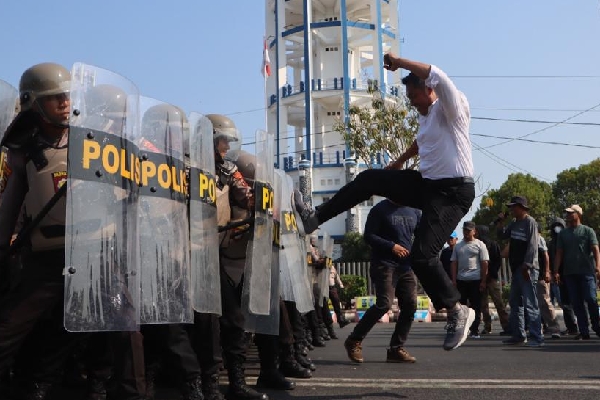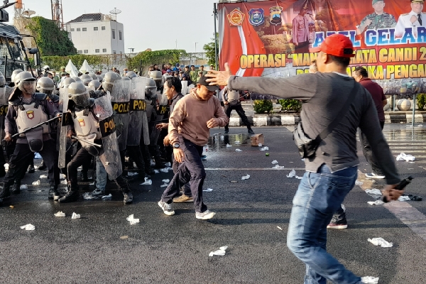 Perusuh siapkan lemparkan sesuatu ke aparat, dalam simulasi
