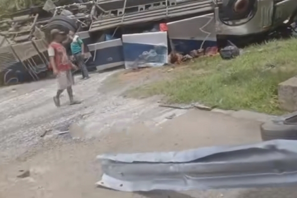 Dari pantuan, kecelakaan tersebut membuat posisi terbalik 180 derajat dengan bagian atas di bawah. Berdasarkan video yang beredar di media sosial, bagian atap depan bus ringsek.