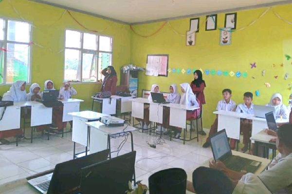 Mahasiswa UP memberikan pengenalan media pembelajaran digital kepada siswa MI Ta’alumul Syibyan. (Foto: Dok)
