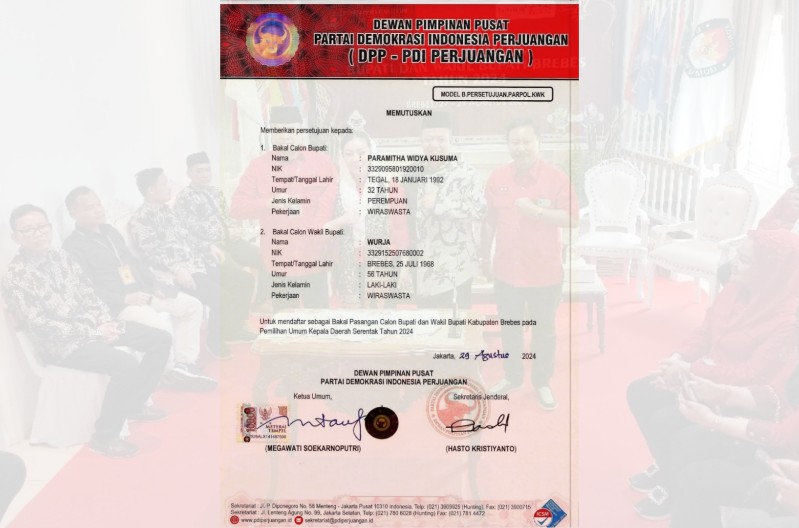 PanturaNews (Brebes) - Pasangan calon (Paslon) Bupati dan Wakil Bupati Brebes Paramitha Widya Kusuma dan Wurja akhirnya resmi mendapatkan rekomendasi dari DPP PDIP yang ditandatangi langsung oleh Ketua Umum Megawati Soekarnoputri, Kamis 29 Agustus 2024, sekitar pukul 13.30 WIB.