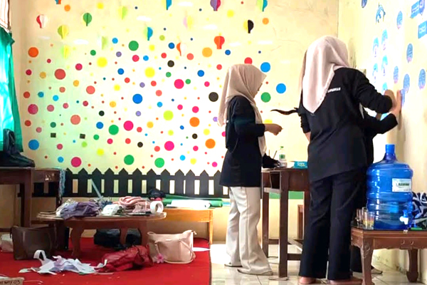 Mahasiswa pun dengan sabar membimbing dan memberi motivasi agar siswa bebas berekspresi sesuai kreativitasnya. Tawa dan canda mewarnai proses menghias, menjadikan kegiatan ini bukan hanya tentang memperindah ruangan, tetapi juga membangun keakraban dan rasa memiliki terhadap ruang literasi yang diciptakan bersama.