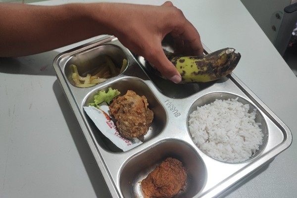 Di lokasi distribusi inilah, sorotan tajam tertuju pada kualitas makanan. Salah seorang siswa laki-laki di SMA 3 Brebes membuka nampan makanannya. Di antara nasi, ayam goreng, dan sayuran, ia mengambil sepotong buah pisang yang terlihat sudah terlalu matang hingga sebagian besar kulitnya berwarna hitam dan terdapat bercak-bercak busuk.