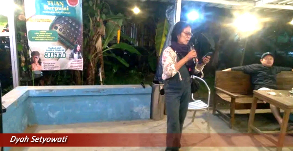Ia kemudian membacakan puisi “Nging”, yang memotret trauma masa reformasi. Gambaran tentang kuping yang pecah dihantam gagang senjata membuat suasana mendadak muram, tetapi penuh kekuatan.