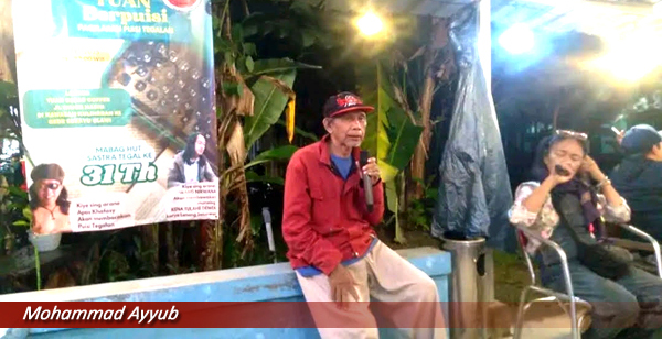 Penyair Mohammad Ayyub, atau yang akrab disebut “Profesor Embé”, tampil membacakan pidatonya. Ia menceritakan perjalanan panjang puisi Tegalan hingga menembus panggung internasional bahkan tampil di Malaysia dalam festival lima negara. Puisinya juga menjadi satu-satunya karya berbahasa daerah yang dimuat dalam antologi penyair nusantara di Riau.