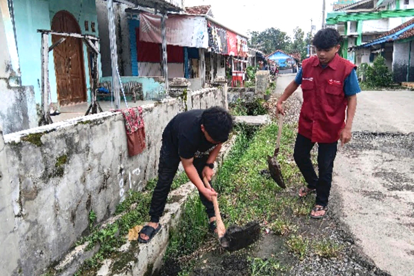 MAHASISWA Kuliah Kerja Nyata (KKN) Universitas Peradaban (UPB) Bumiayu, Kabupaten Brebes dan Universitas Muhammadiyah Purwokerto (UMP) kerja bakti membersihkan lingkungan dan saluran air di wilayah RW 7 RT 7 Desa Pangebatan, Kecamatan Bantarkawung, Kabupaten Brebes.